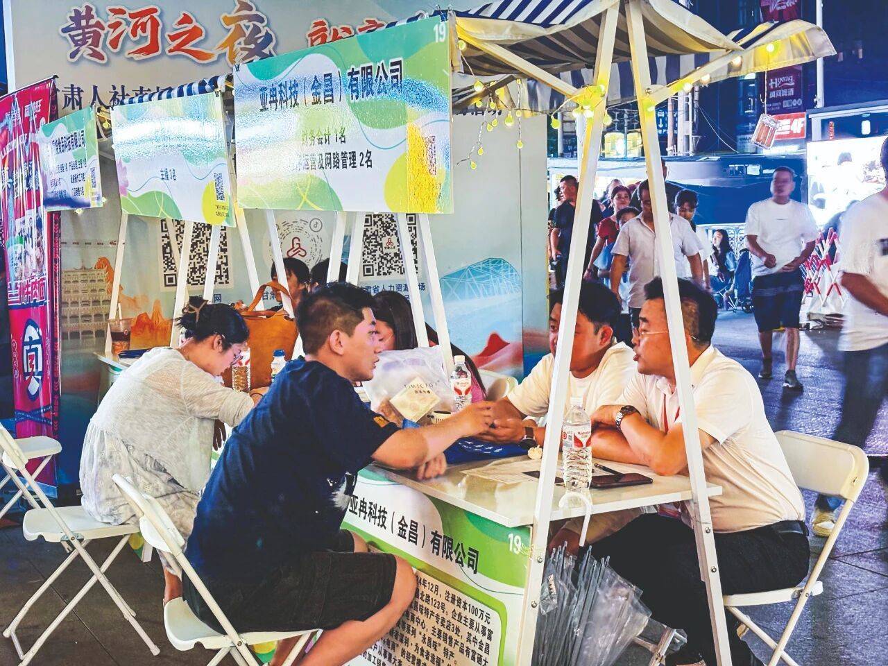 夜幕降临,甘肃省兰州市的各大商业街人流如织。一处“人才夜市”汇聚多家企业HR,求职者伴着月色与晚风,边逛街边求职。